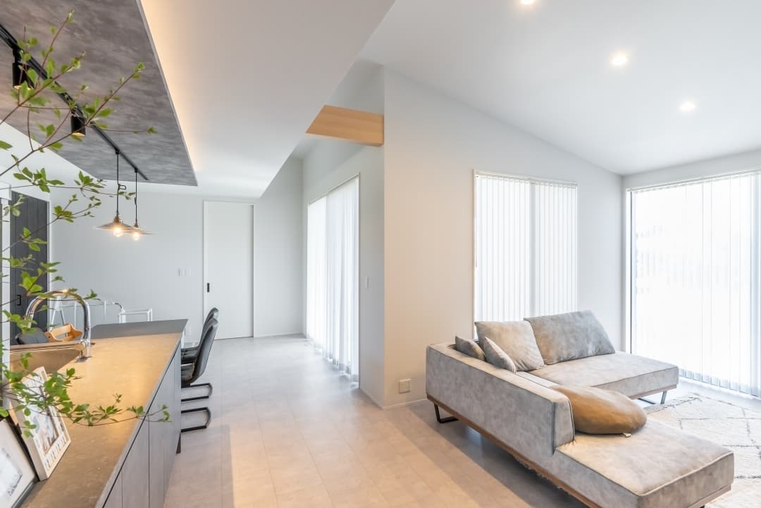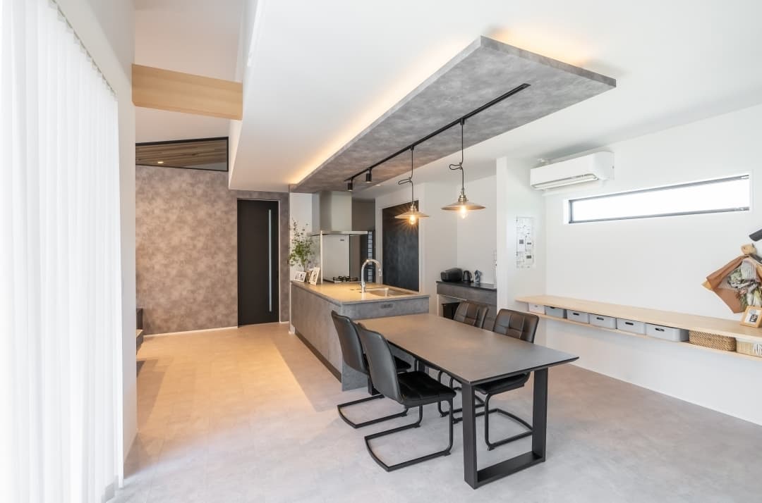 玄関扉を開けた瞬間に、すごい家!になるよう広さ、奥行き、目線、を考え、お施主様が好みのホテルライクな室内になるよう床をLIXILのコンクリート調の仕上げを採用しました。全体の色味としては、コンクリート色をベースに考え、キッチン単体でも高級感出るような商品を選び、キッチンダイニング上に天井化粧を施し、間接照明を設置し非現実空感が出るように演出しています。また、十分広いLDKをさらに広く見えるよう玄関は勾配天井にして、リビングとガラスで繋げ奥行が出るようにしました。