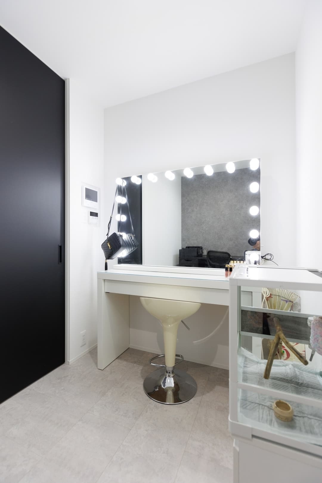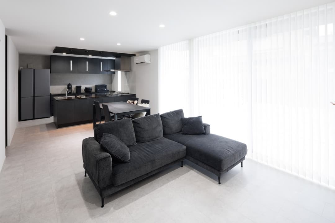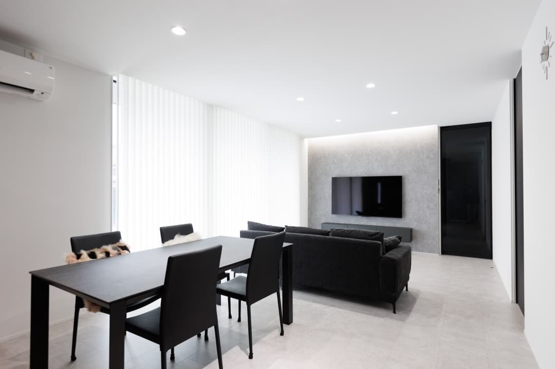 このモノトーンでホテルライクな家の内観デザインとインテリア設計は、洗練されたシンプルさとラグジュアリーな雰囲気が特徴です。壁や床、家具などの要素はモノトーンで統一され、モダンでクリーンな印象を与えます。照明は間接照明やダウンライトを活用し、空間に柔らかな光を演出しています。全体的に、モノトーンのシンプルさとホテルライクなラグジュアリー感が見事に融合し、居心地の良さと上質な生活空間を提供しています。