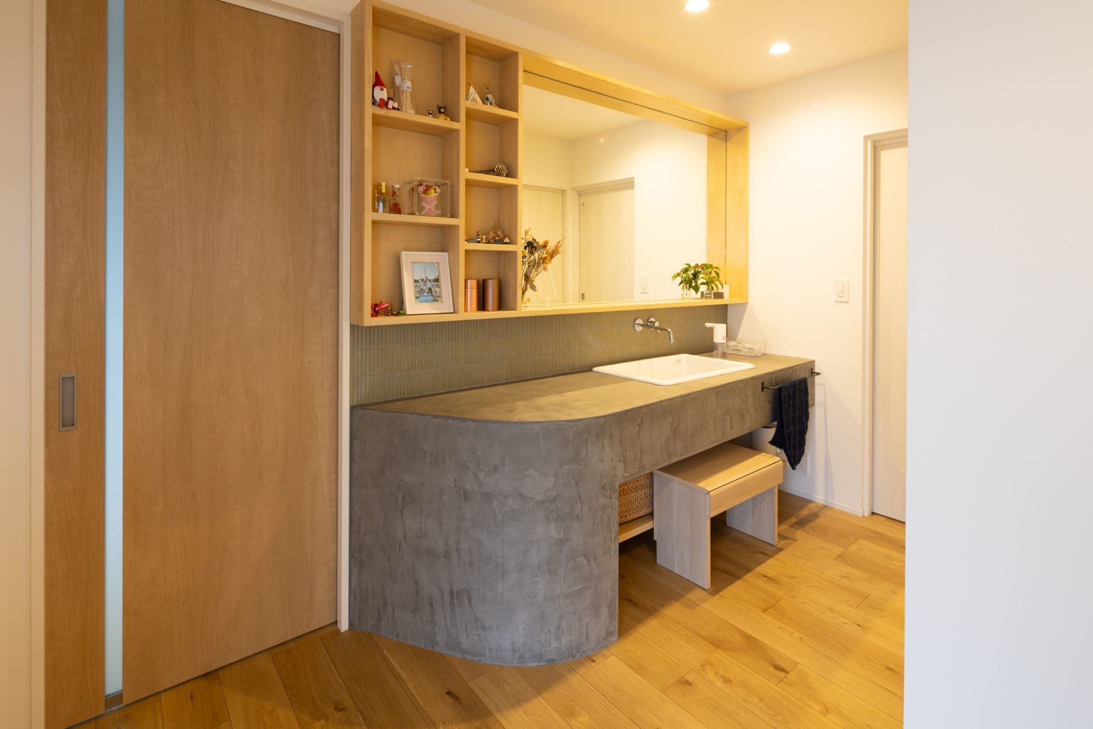 玄関に入るとすぐ、手洗いうがいが可能になるように且つ、玄関先ということもあり、おしゃれなモールテックの流し台があります。