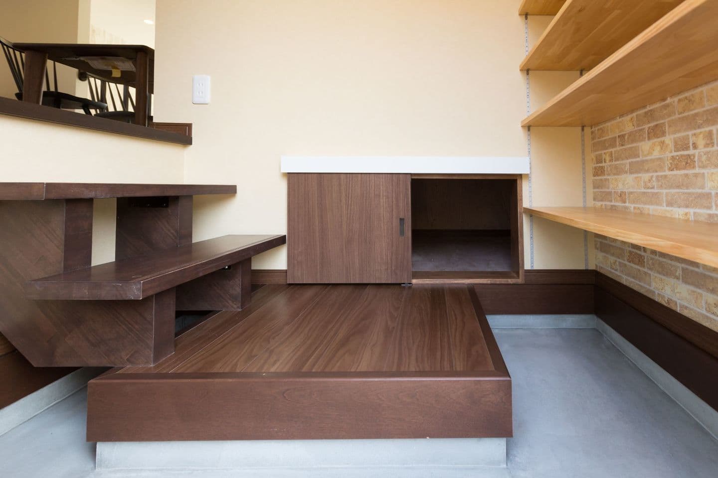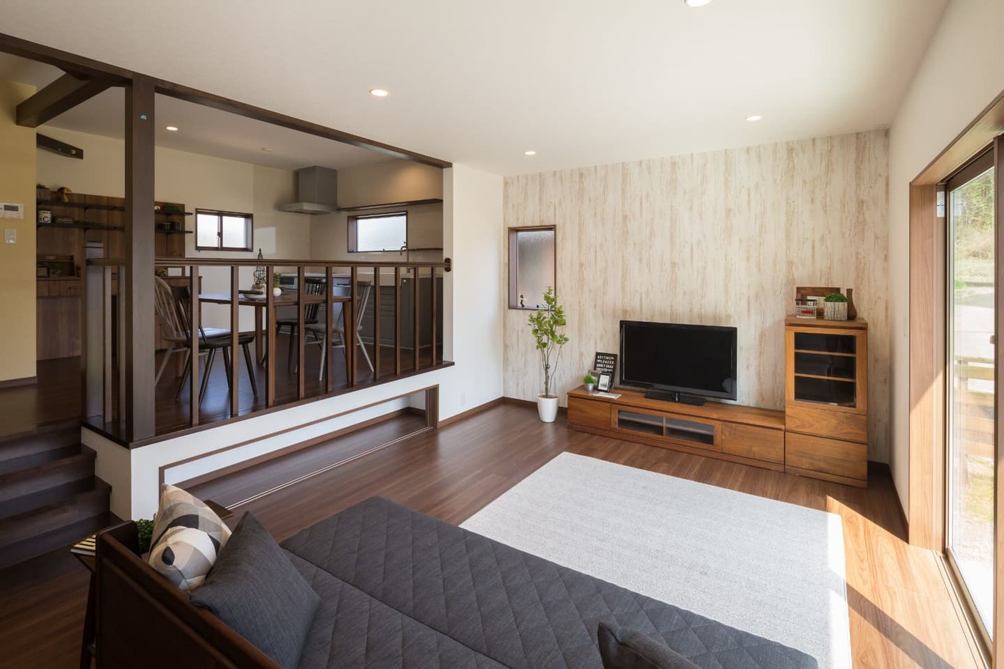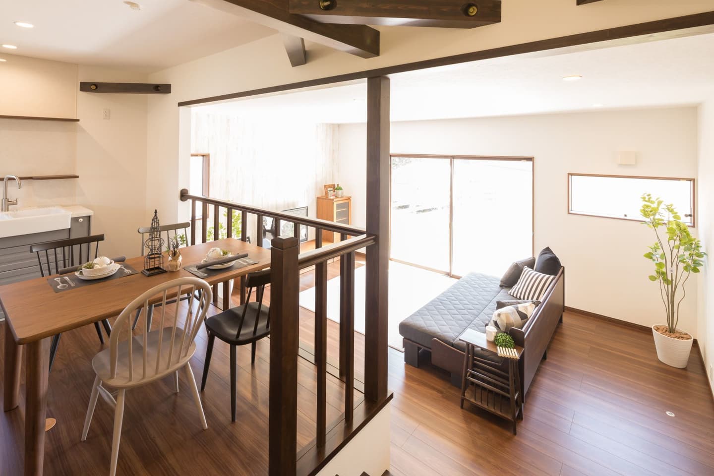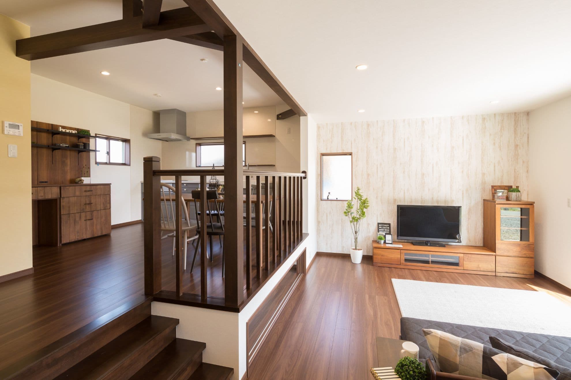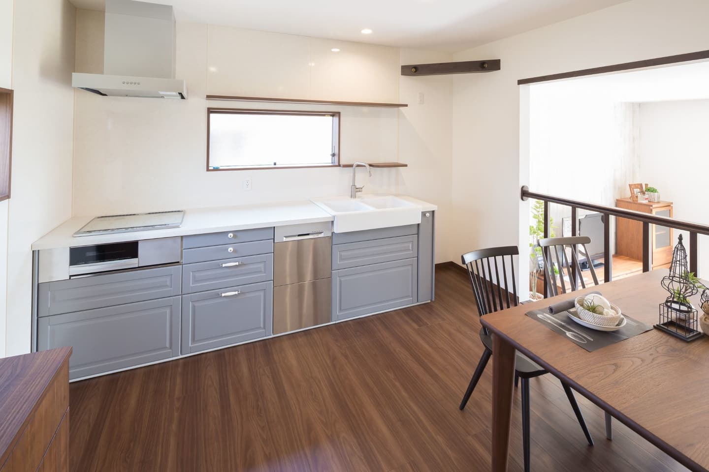 NATURAL COUNTRY HOUSE NATURAL COUNTRY HOUSE 「ナチュラルカントリー」がテーマのお家です。リビングからウッドデッキへの繋がりを大切にしており、幅の広い掃き出し窓を設けました。リビングから床を上げた「スキップフロア」のダイニングキッチンは、お施主様こだわりのポイントです。床下の段差を利用し、収納スペースを作りました。 ALL 平屋 2階建て リノベーション 店舗 ALL 平屋 2階建て リノベーション 店舗