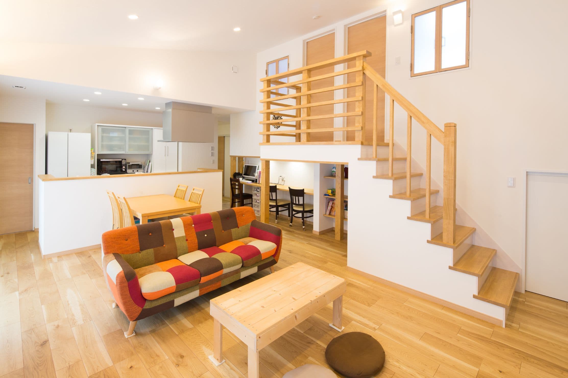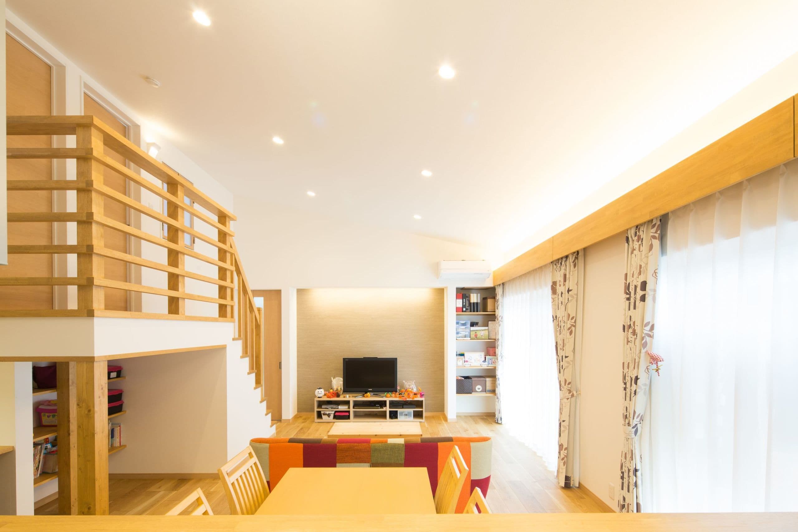~ 斜 ~ コンパクトに間取りを整えながらも収納力抜群なお住まいです。広いリビングから子供部屋に上る8段の階段がリビングをおしゃれに演出。平屋で将来を見据えた使い勝手のいい間取りです。またシンプルな外観が目を引きます。玄関先の軒下スペースを広くする事で、自転車置き場にもなり雨の日対策も万全です。リビング上の大きな吹抜けと窓上の間接照明による空間演出が見どころです。 ALL 平屋 2階建て リノベーション 店舗 ALL 平屋 2階建て リノベーション 店舗