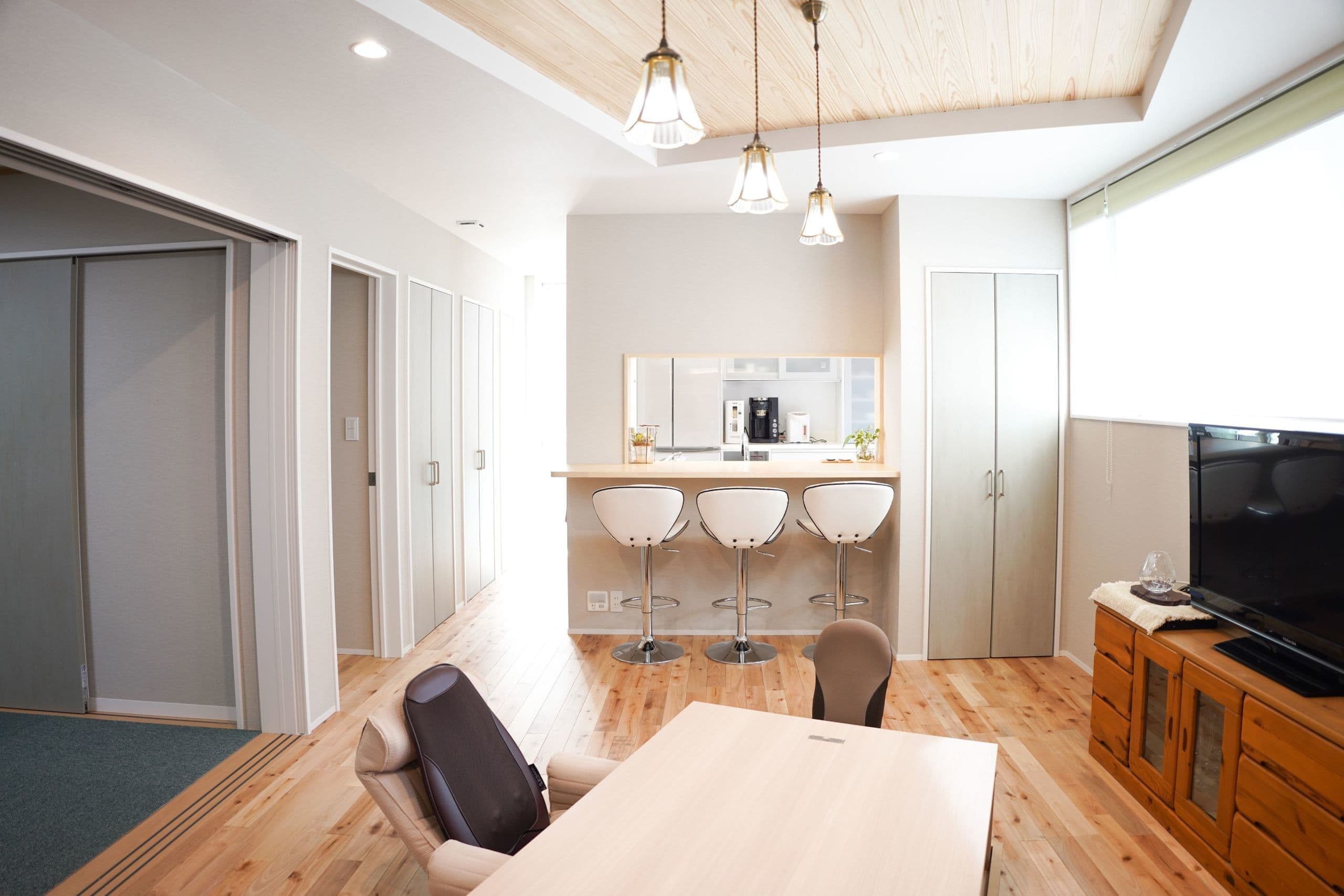 高台の斜め壁の平屋 高台に建つため、太陽に素直な設計と庇の長さも検討して南側からも形の良い外観を設計しました。屋根勾配と窓位置を考え、どこにいても明るく生活できるように配慮しました。 ALL 平屋 2階建て リノベーション 店舗 ALL 平屋 2階建て リノベーション 店舗