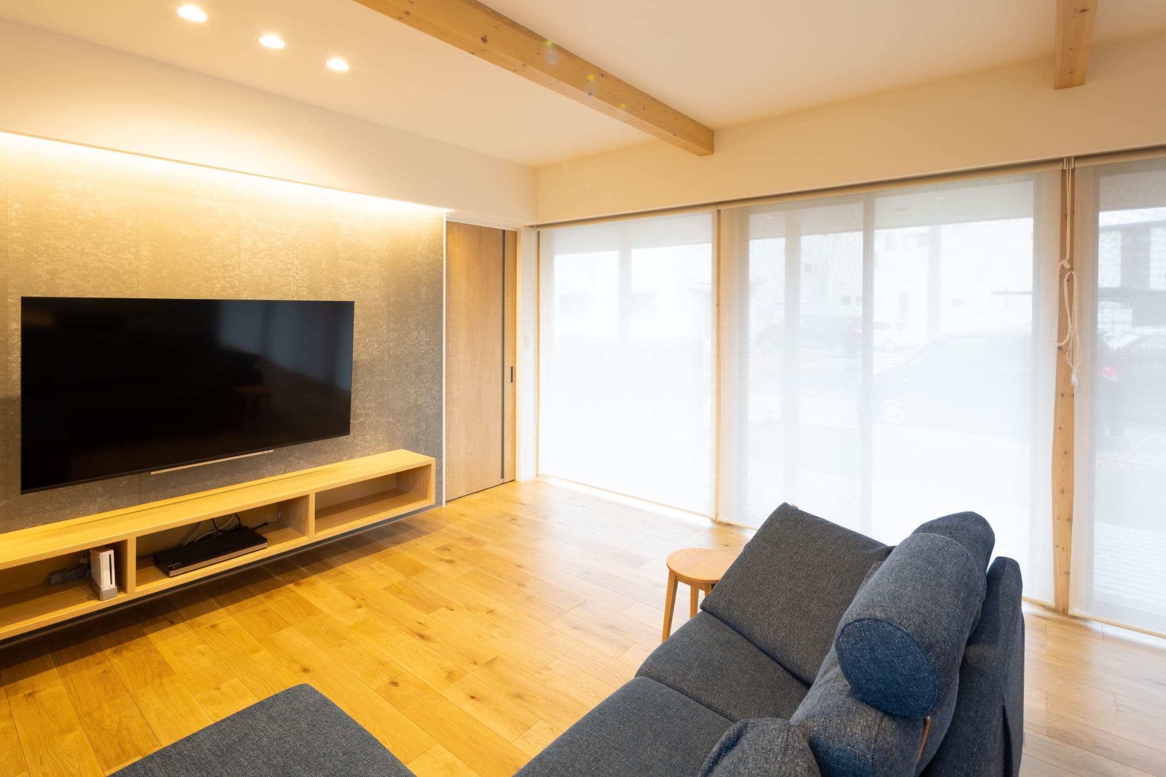 TVボードの裏にはKMEWのSOLIDOリサイクル内装ボードを使用し、上質で落ち着いた空間になりました。