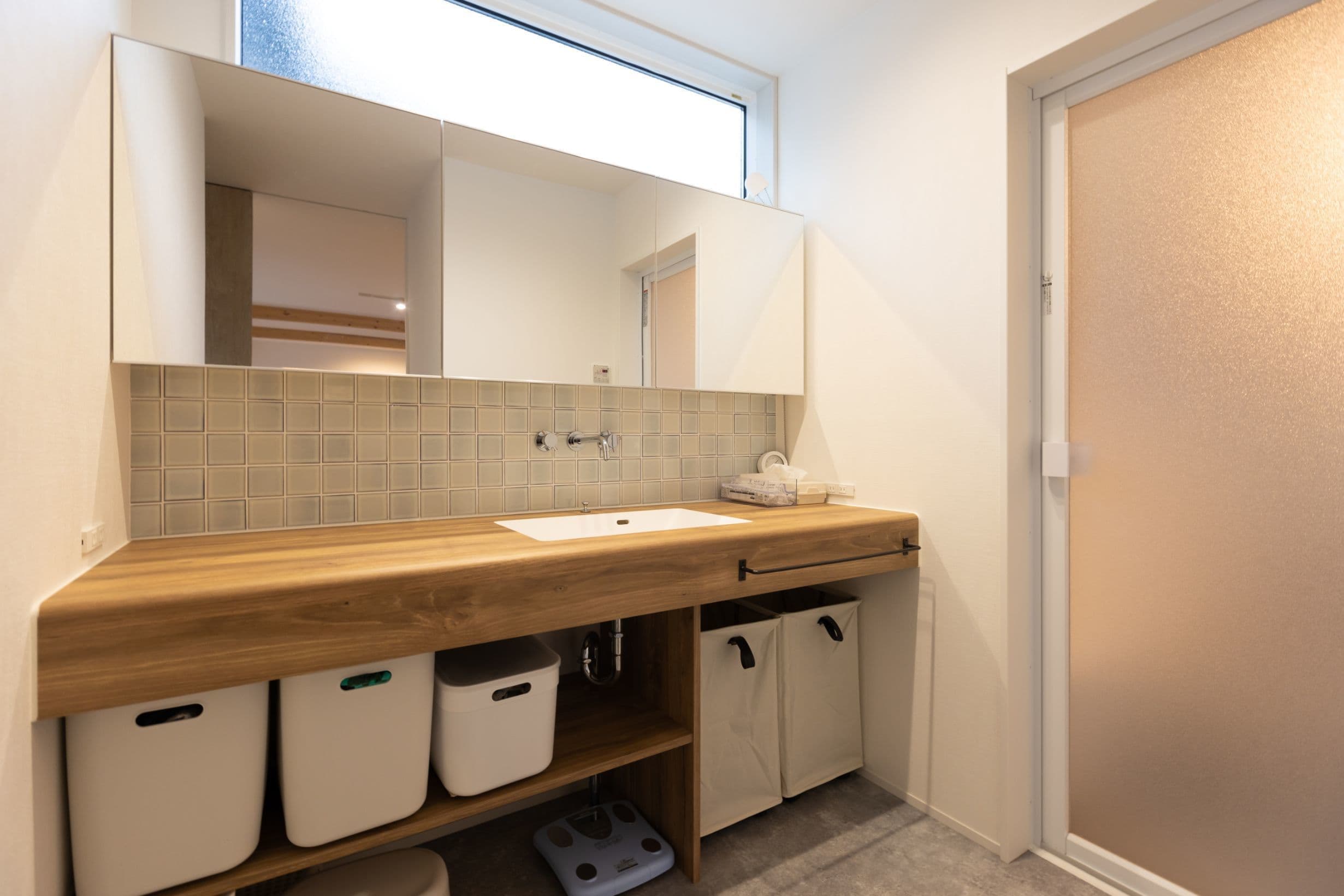 玄関に入るとすぐ、手洗いうがいが可能になるように且つ、玄関先ということもあり、おしゃれなモールテックの流し台があります。