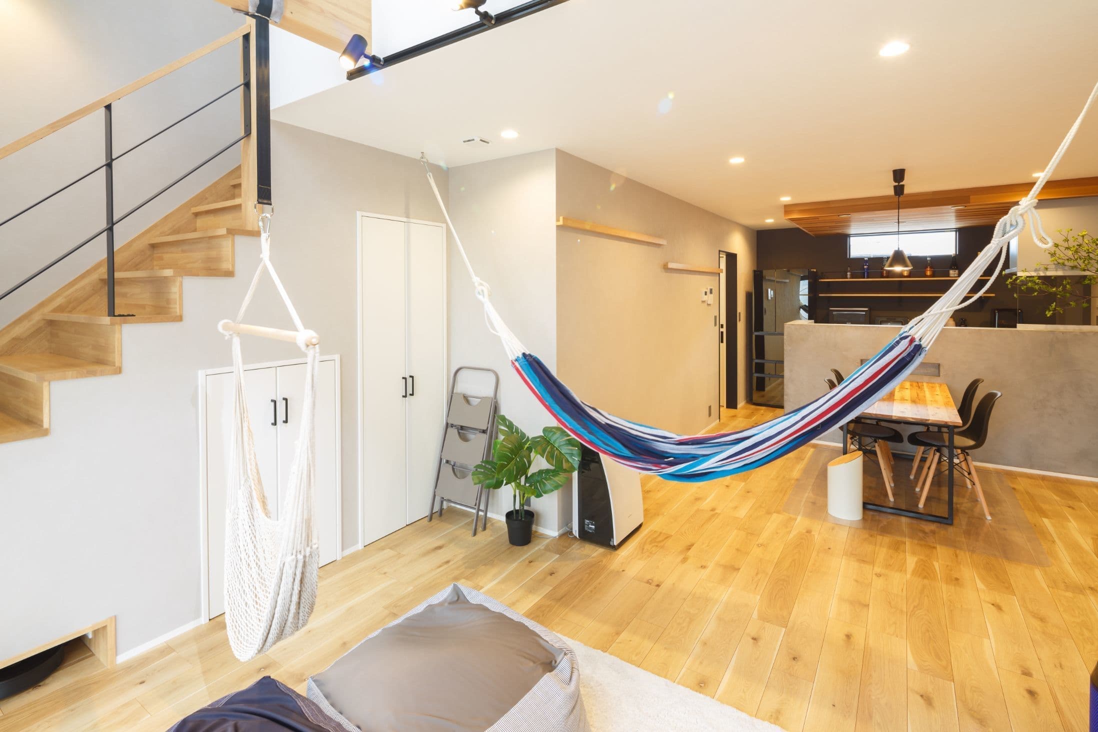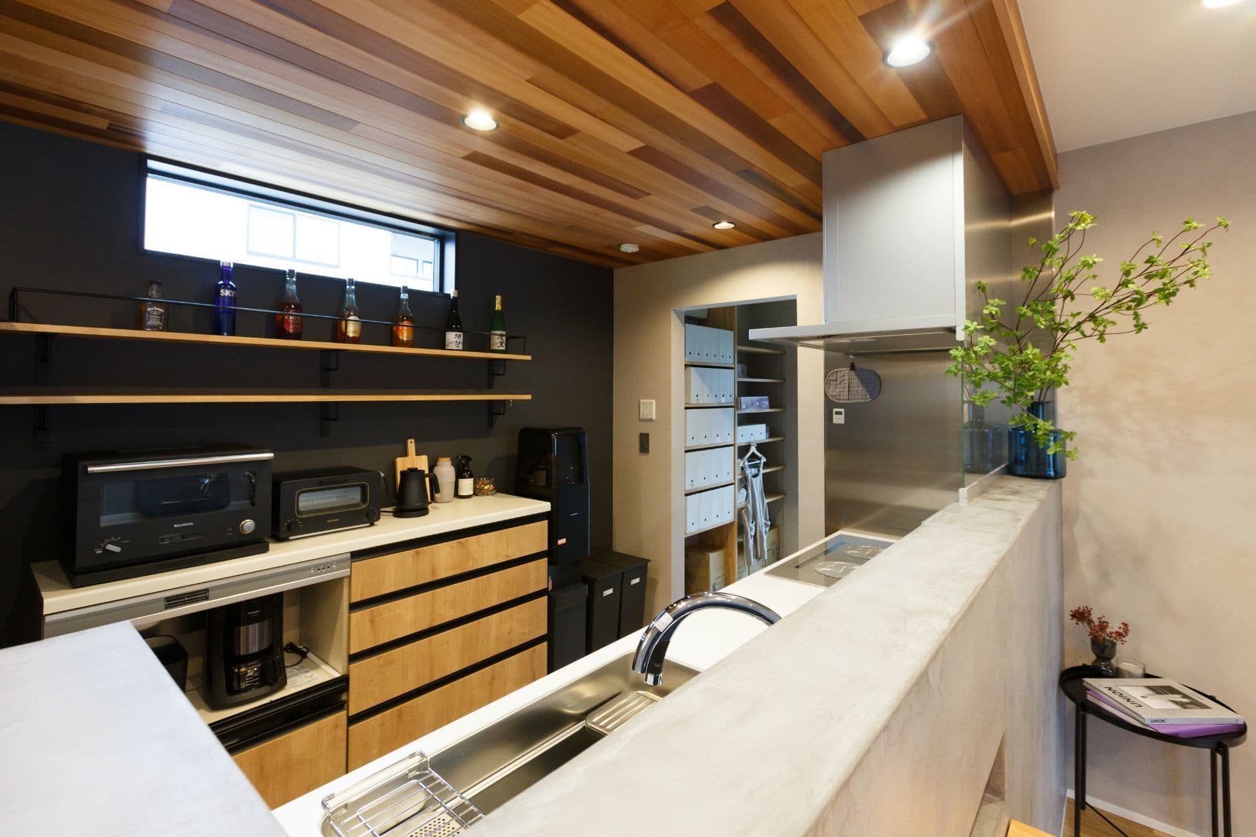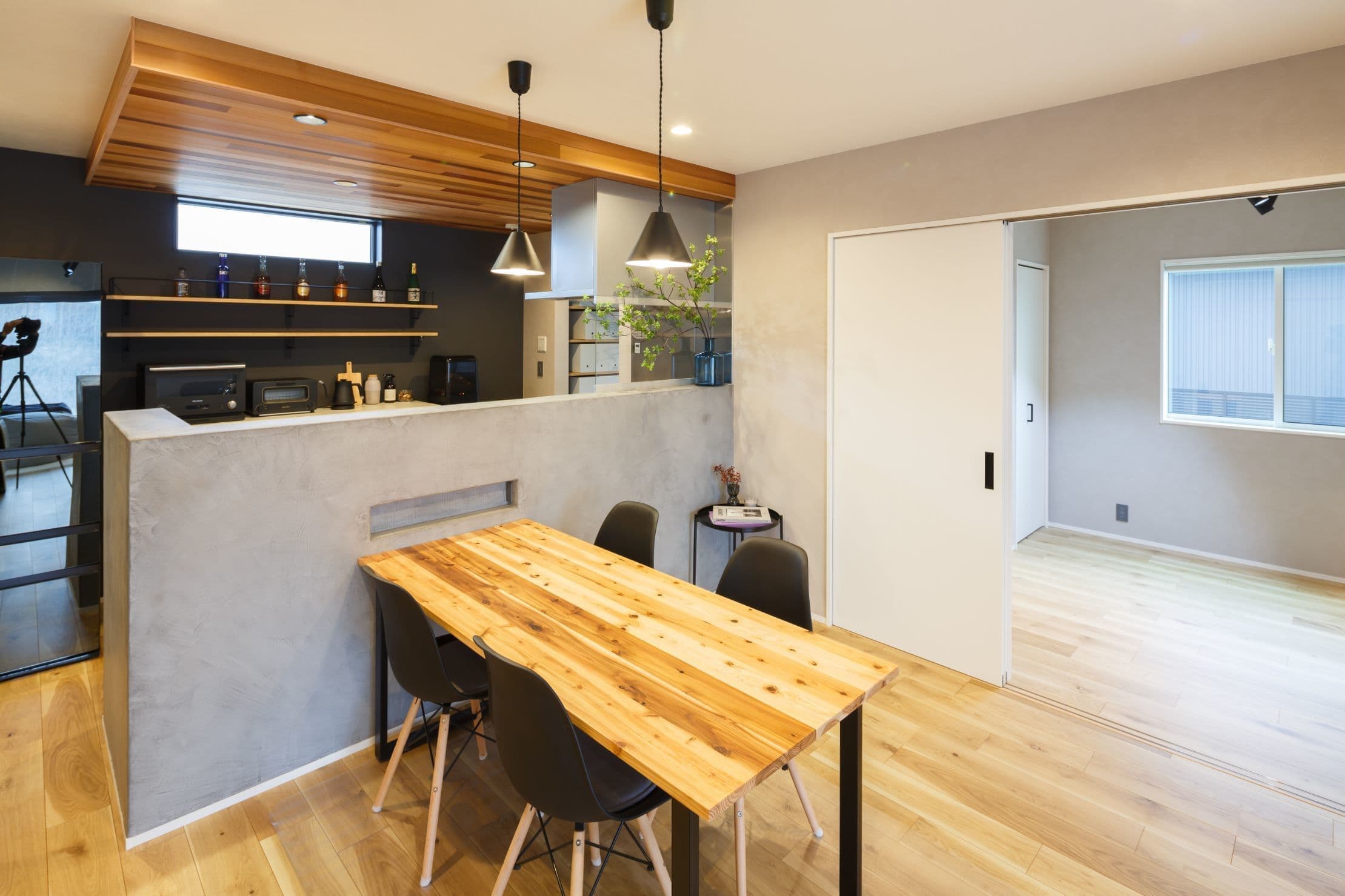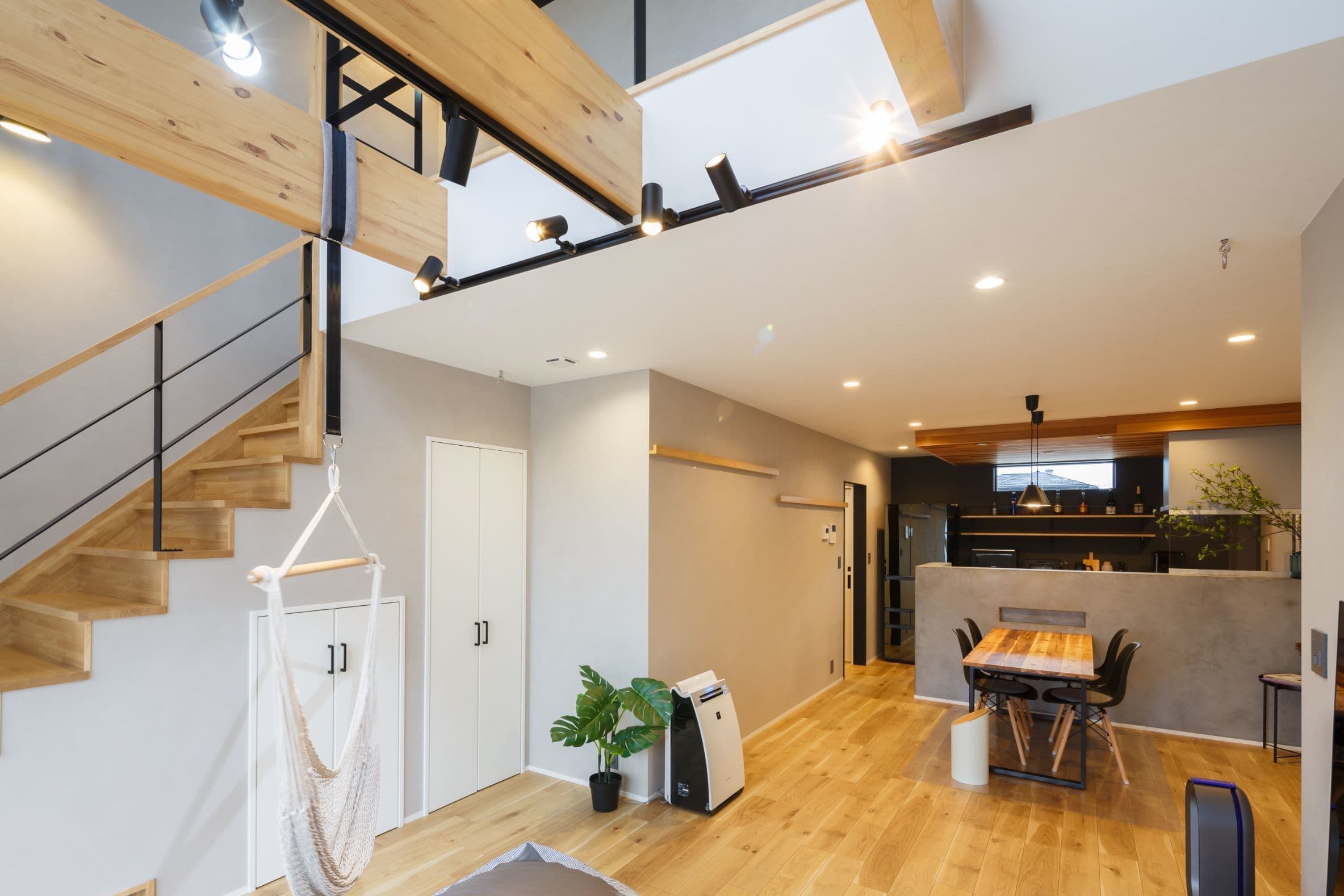 NOSTALGIA GRAY 外観はネイビーブラックのガルバニウムと木目調のアクセントでシンプルにカッコよく。内観はモールテックスやアイアン手摺など、ポイントにエッジを効かせたグレーのコーディネート。細部までこだわったトレンド感ある内装のお洒落なお家が完成しました。 ALL 平屋 2階建て リノベーション 店舗 ALL 平屋 2階建て リノベーション 店舗
