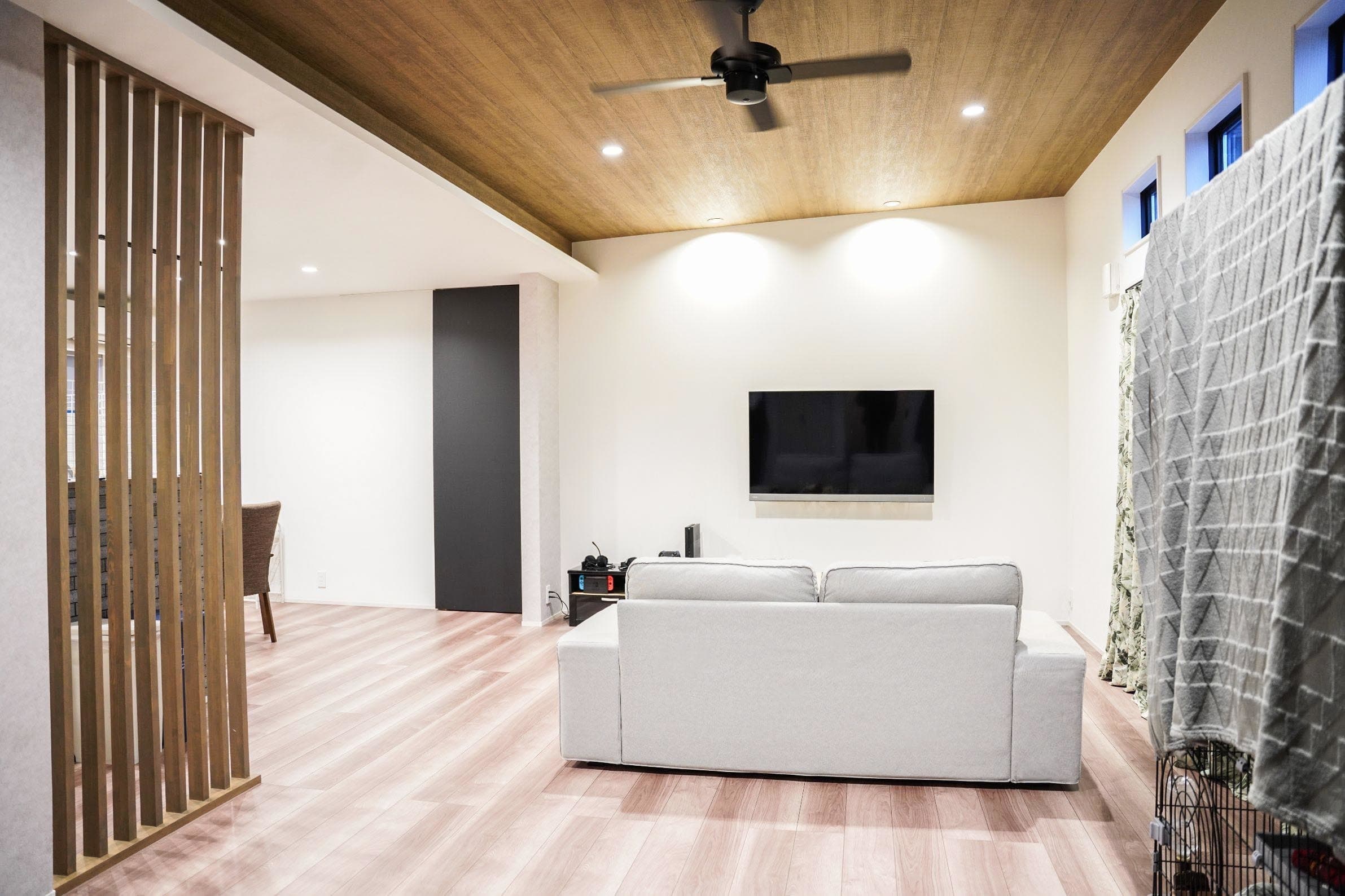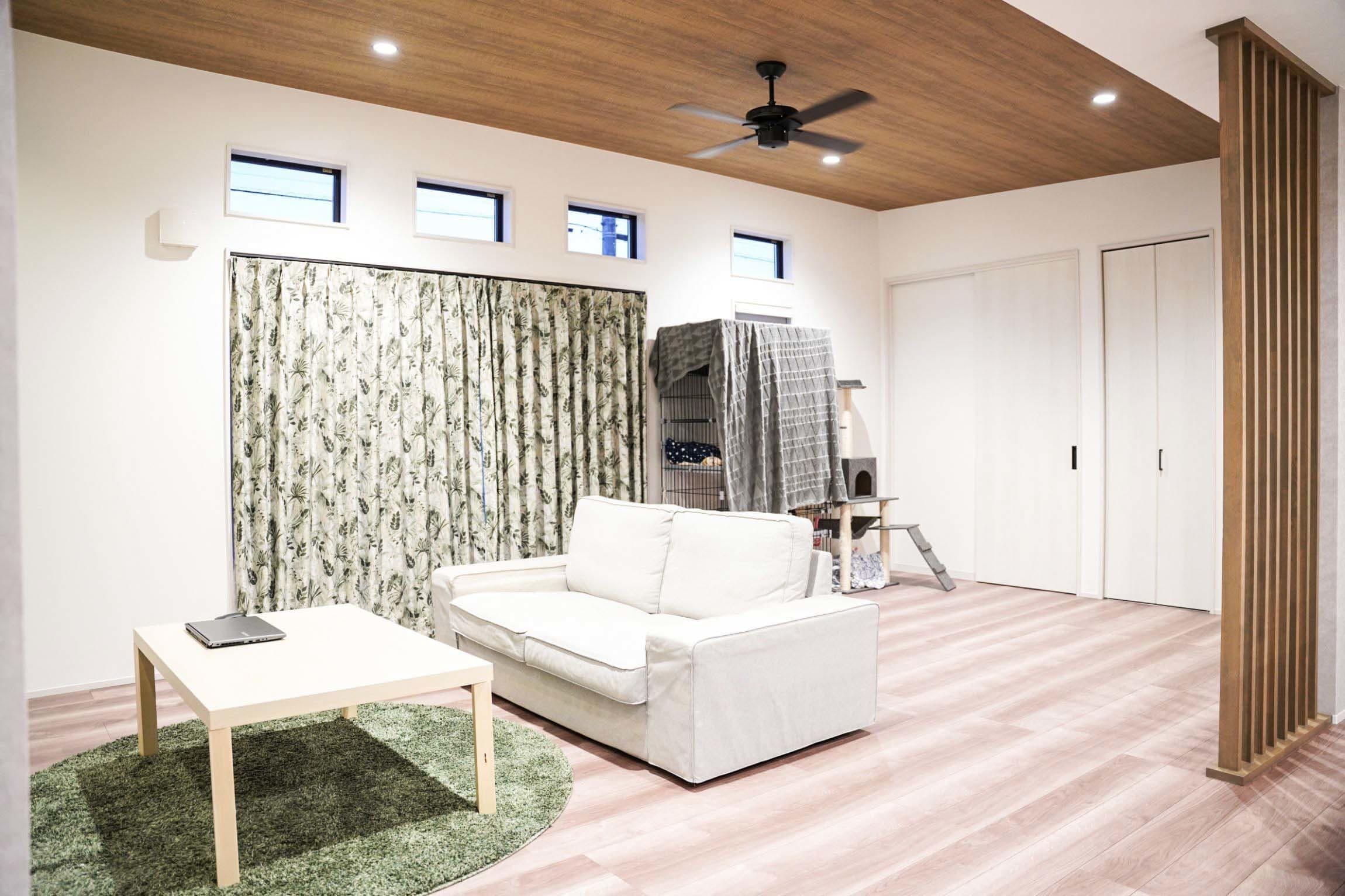 広々としたリビングは家族全員でくつろぐことができ、一年中快適に過ごしています。